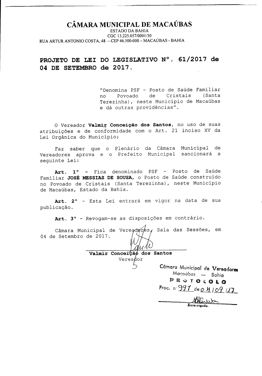 Foi apresentado o PROJETO DE LEI DO LEGISLATIVO Nº 61/2017 “Denomina PSF – Posto de Saúde familiar no povoado de Cristais (Santa Terezinha), neste Município de Macaúbas e dá outras providencias”.