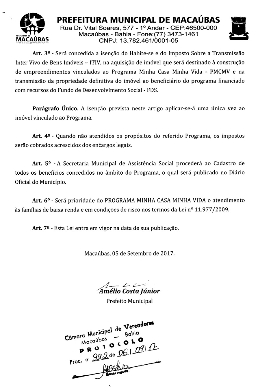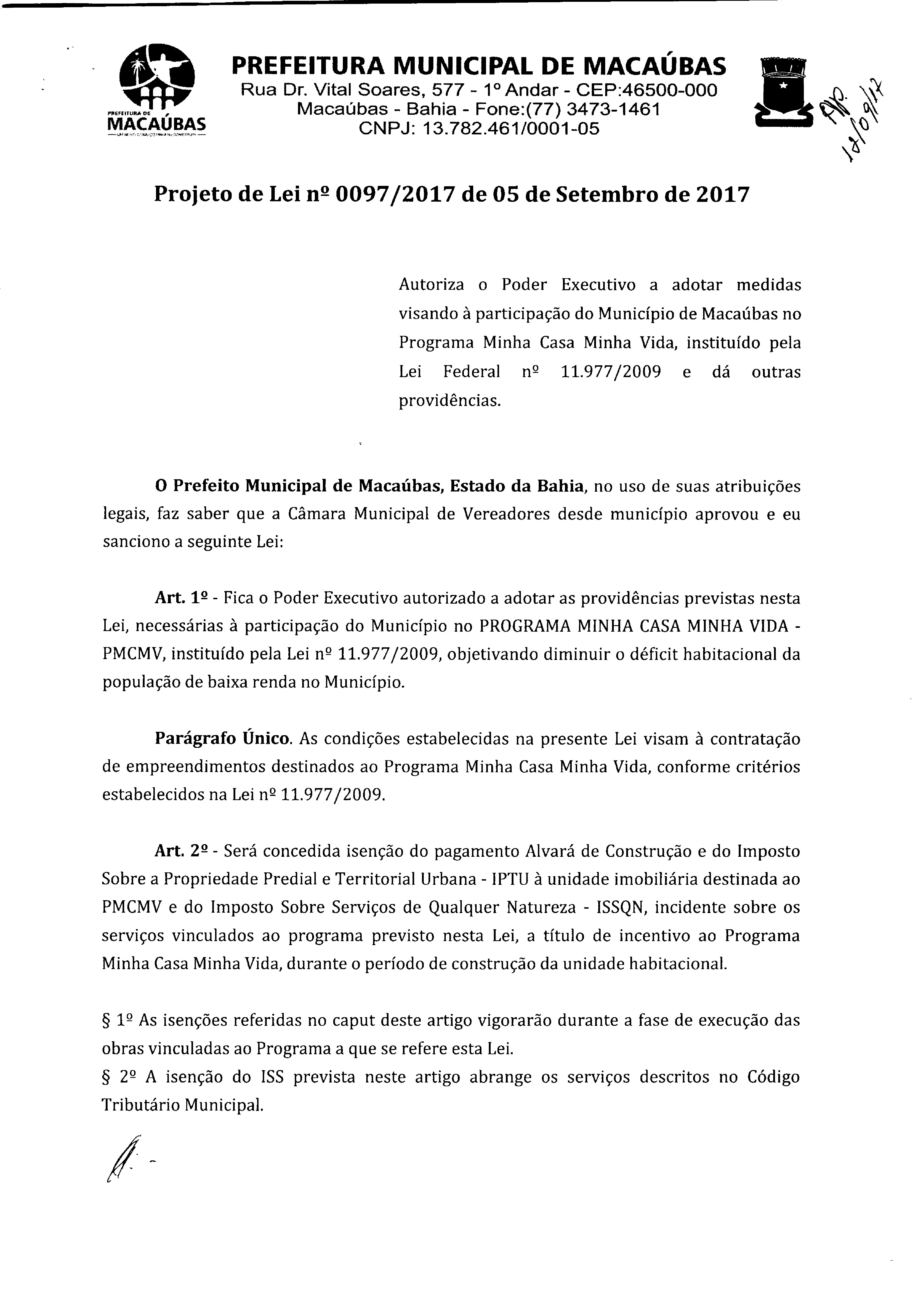 Foi aprovado em votação única o PROJETO DE LEI DO EXECUTIVO Nº 097/2017 “Autoriza o poder executivo a Adotar à participação do Município de Macaúbas no programa Minha Casa Minha Vida, instituído pela Lei Federal nº 11.977/2009 e da outras providencias”.