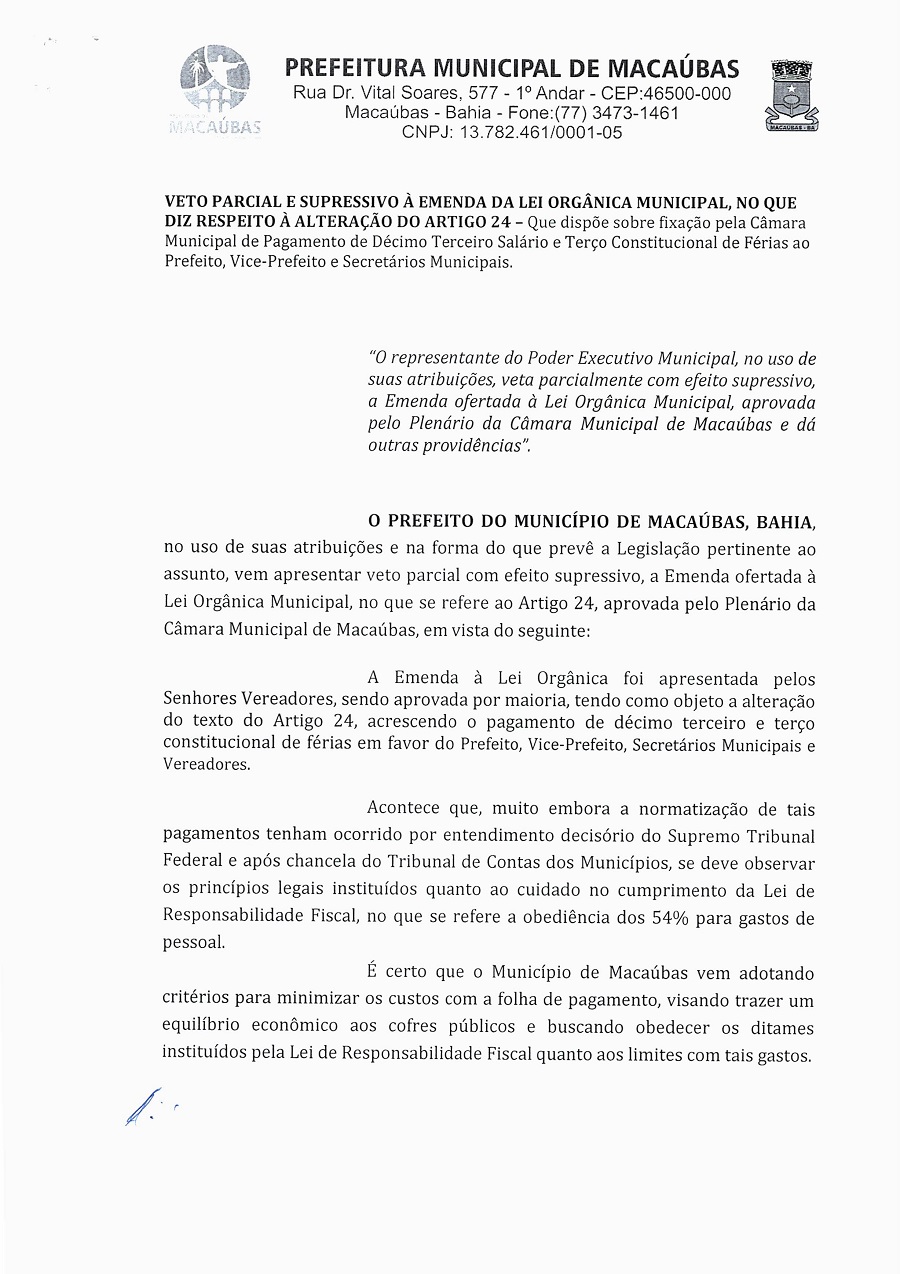 APRESENTAÇÃO DE VETO PARCIAL E SUPRESSIVO A EMENDA DA LEI ORGÂNICA DO MUNICÍPIO.