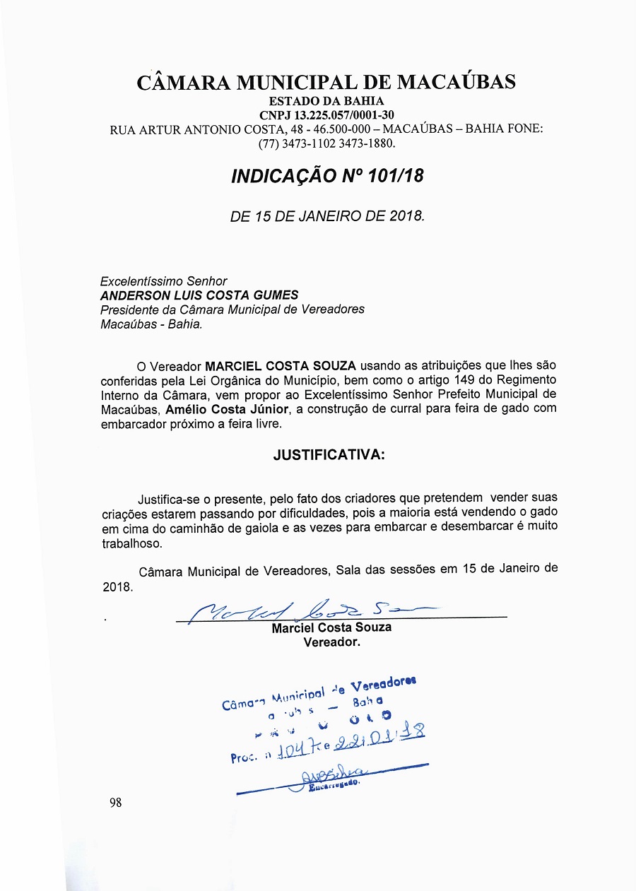 INDICAÇÃO Nº 101/18 de autoria do vereador Marciel Costa Souza
