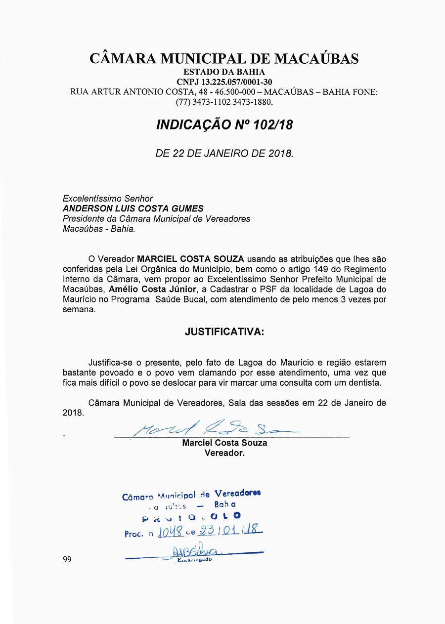 INDICAÇÃO Nº 102/18 de autoria do vereador Marciel Costa Souza