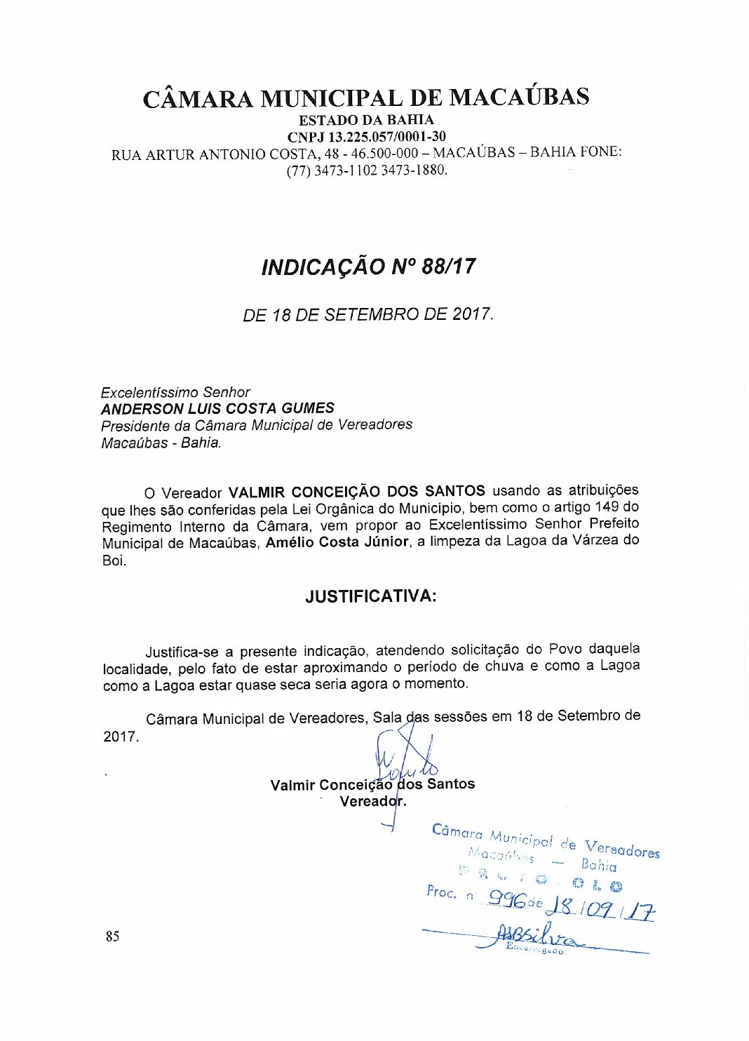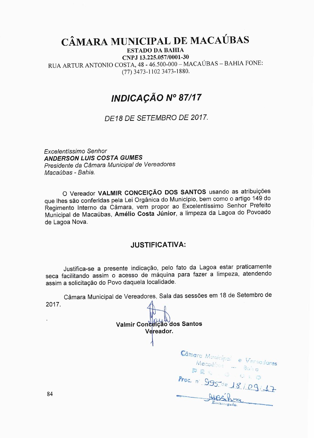 O Presidente abriu a Sessão com a oração de praxe e em seguida apresentou a INDICAÇÃO Nº 87/17 e Nº 88/17 da autoria do vereador Valmir Conceição dos Santos.