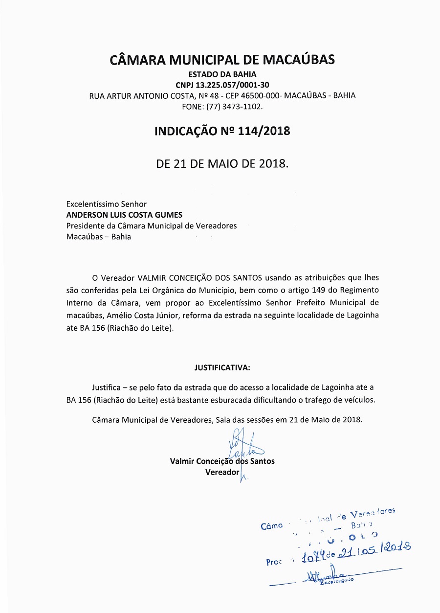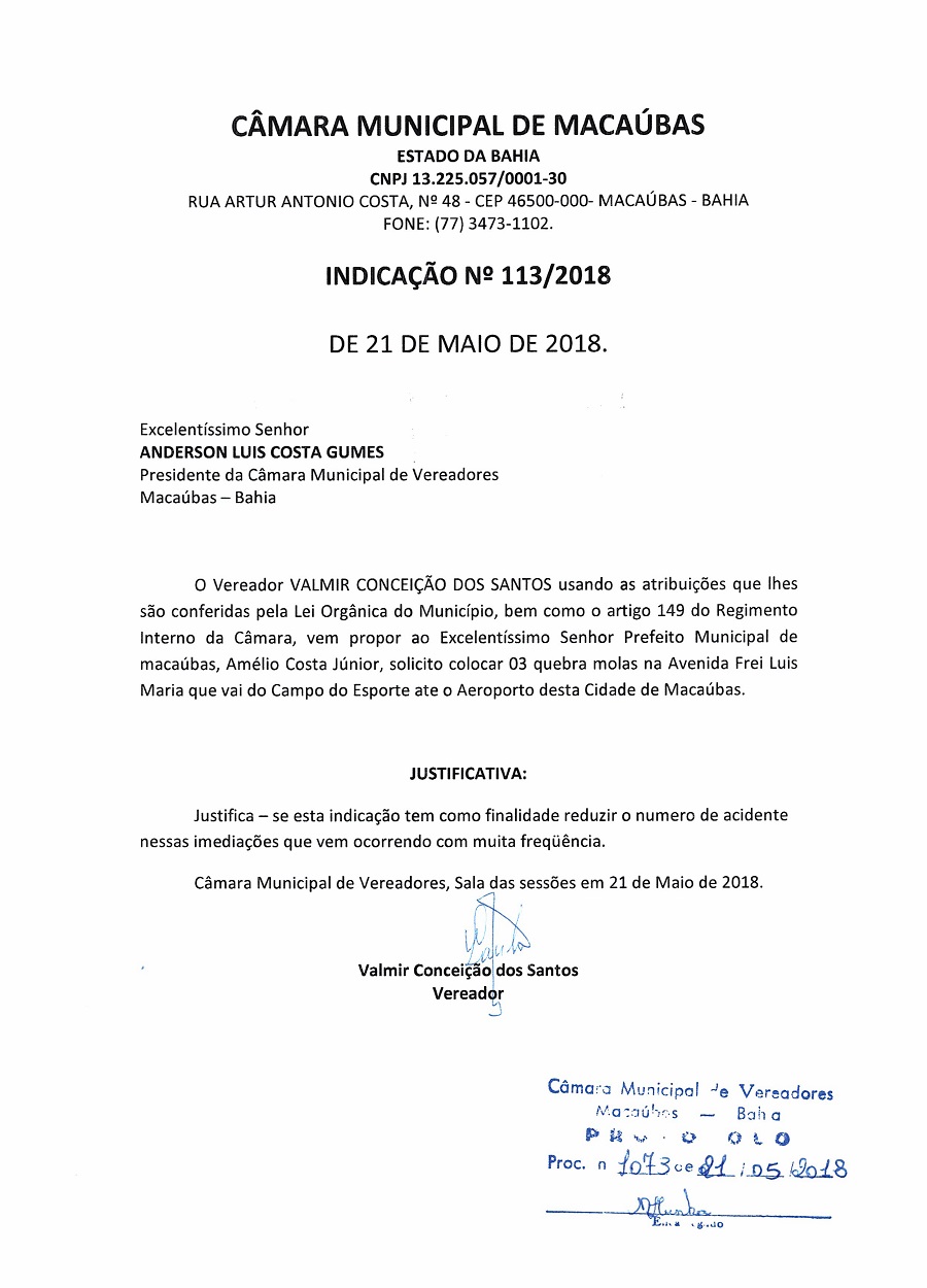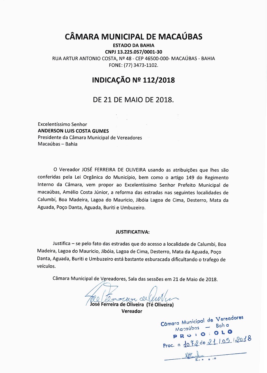 O Presidente do Legislativo Anderson Gumes abriu a Sessão convidando todos os presentes para realizarem a oração de praxe, em seguida leu algumas correspondências, consultou e fez a aprovação da ATA da Sessão anterior, e apresentou as seguintes indicações: Nº 112, 113/18, 114/18 de Autoria dos vereadores Valmir Conceição dos Santos e José Ferreira de Oliveira. Veja abaixo: