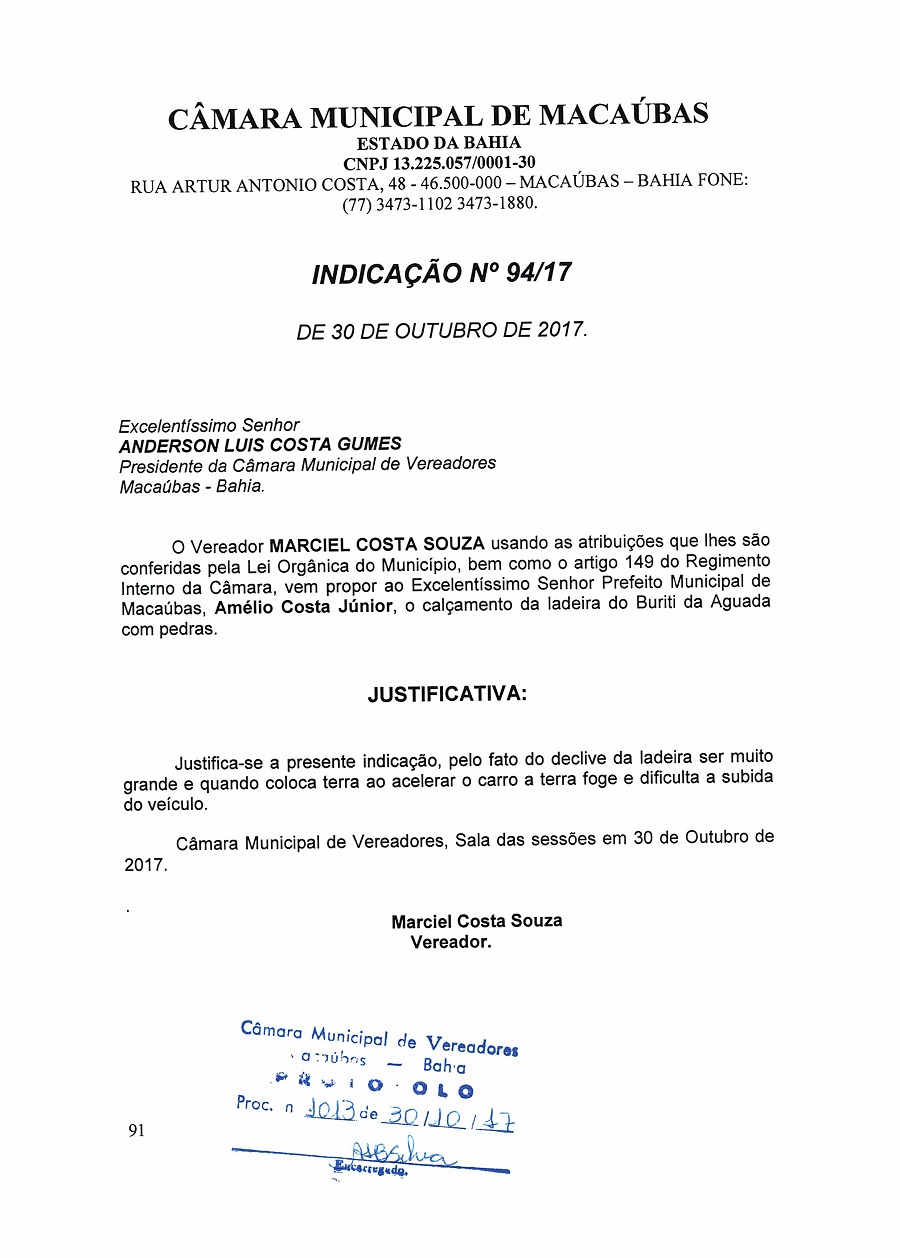 Foi apresentada também a Indicação Nº 94/17, veja abaixo: