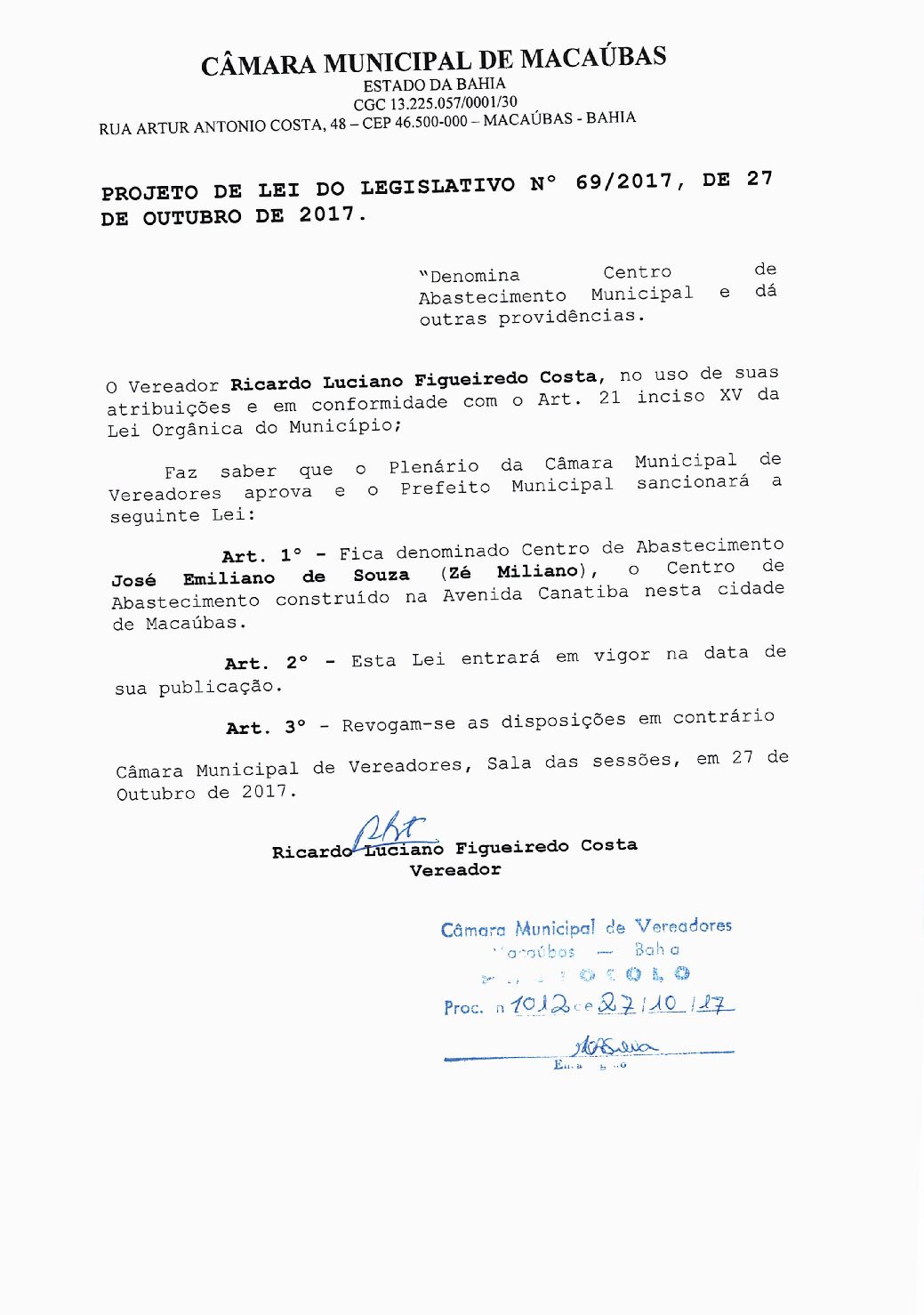 PROJETO DE LEI DO LEGISLATIVO Nº 69/2017 “Denomina Centro de Abastecimento Municipal e dá outras providencias”.