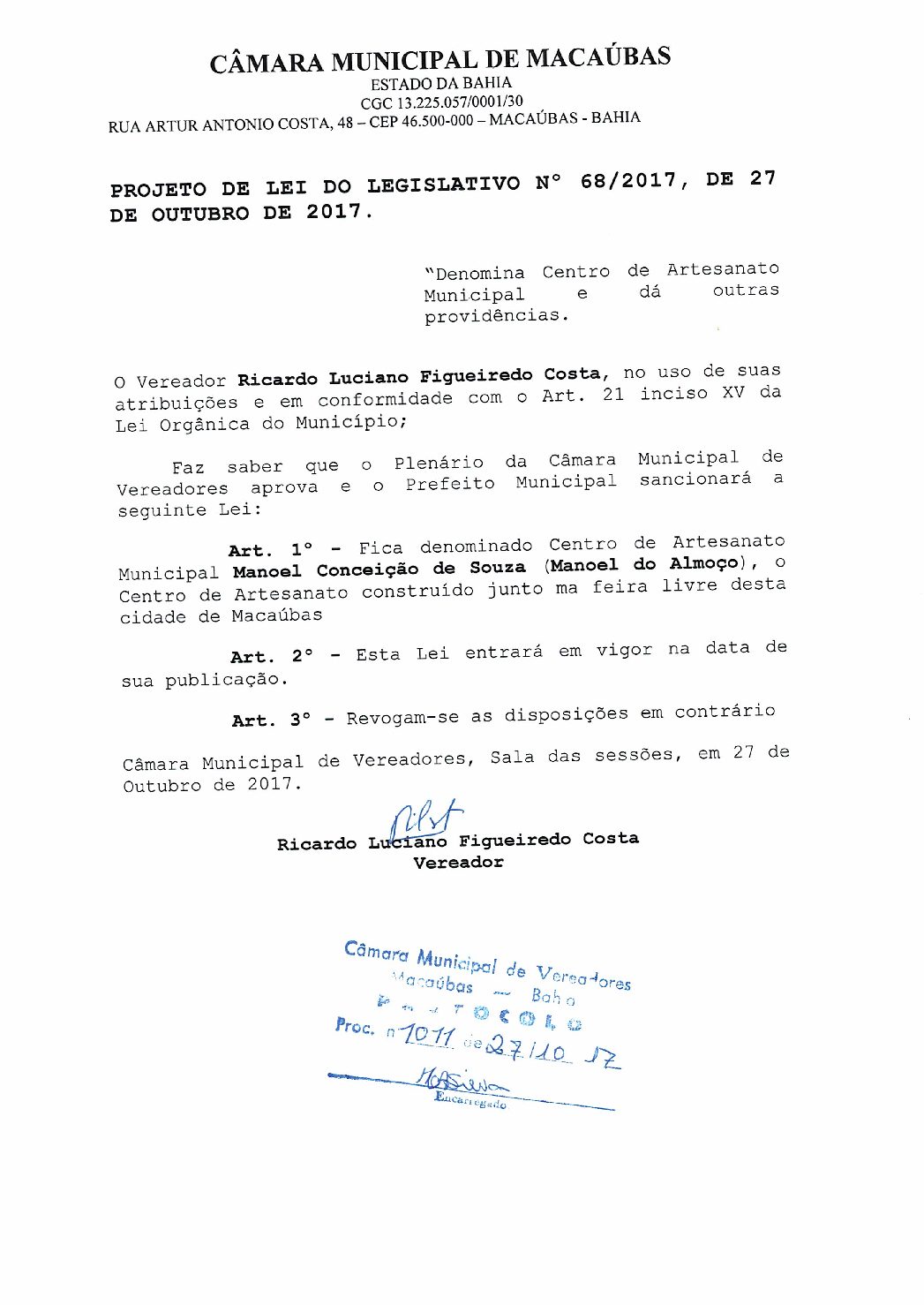 PROJETO DE LEI DO LEGISLATIVO Nº 68/2017 “Denomina Centro de Artesanato Municipal e dá outras providencias”.