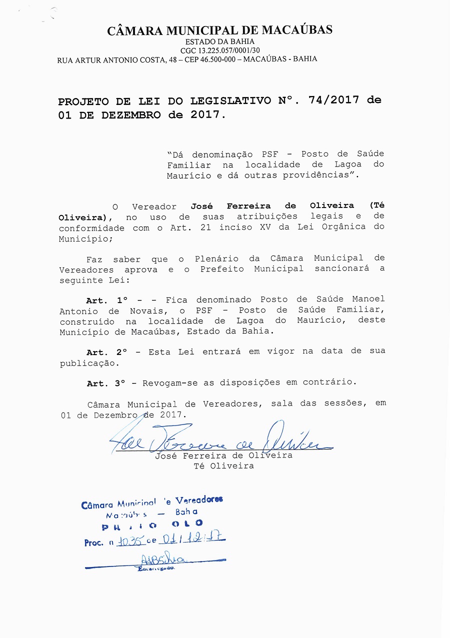 O Presidente da casa Anderson Gumes abriu a sessão apresentando o PROJETO DE LEI DO LEGISLATIVO Nº 74/2017 “Da Denominação PSF Posto de Saúde Familiar na Localidade de Lagoa do Maurício e dá outras providencias”.
