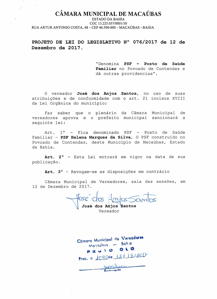 PROJETO DE LEI DO LEGISLATIVO Nº 076/2018 “Denomina – Posto de Saúde Familiar no povoado de Contendas e da outras providencias”