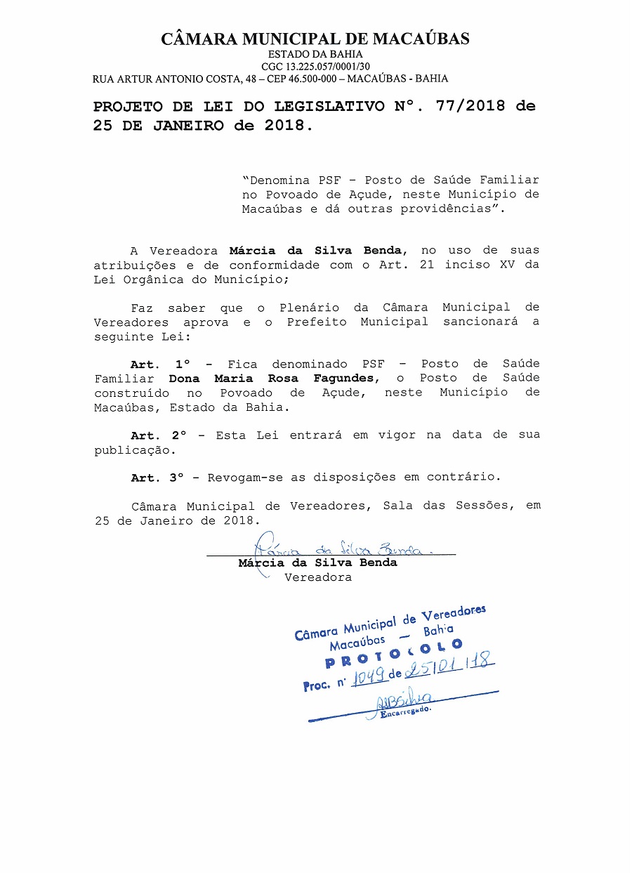 PROJETO DE LEI DO LEGISLATIVO Nº 077/2018 “Denomina – Posto de Saúde Familiar no povoado de Açude e da outras providencias”
