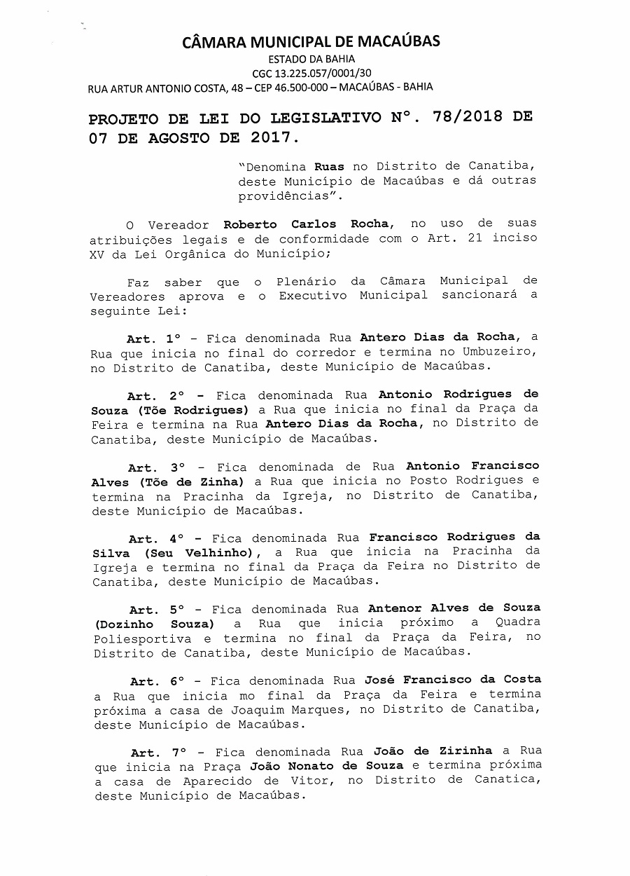 PROJETO DE LEI DO LEGISLATIVO Nº 078/2018 “Denomina Ruas no Distrito de Canatiba, deste Município de Macaúbas e da outras providencias”.