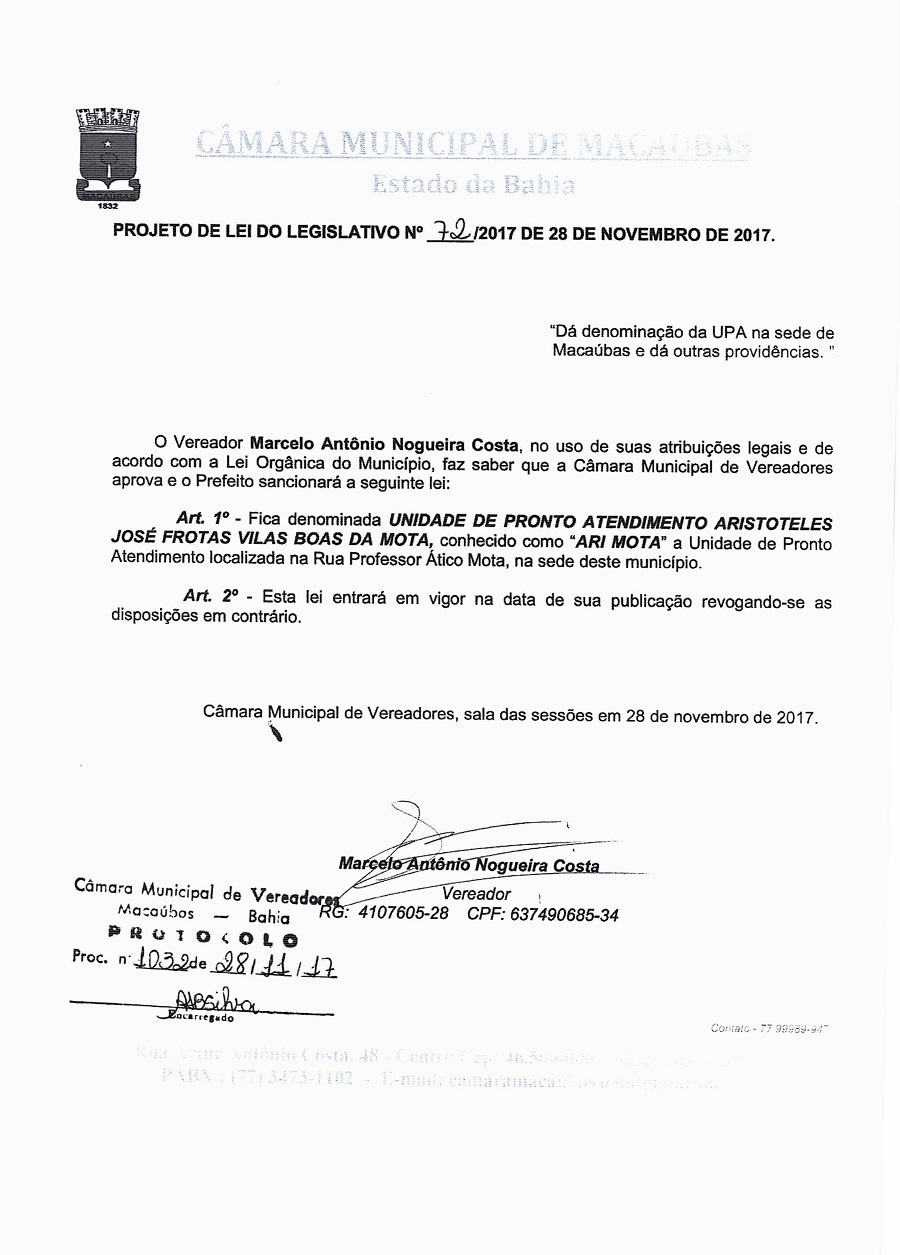 PROJETO DE LEI DO LEGISLATIVO Nº 72/2017 “Da Denominação da UPA na sede Macaúbas e dá outras providencias”.