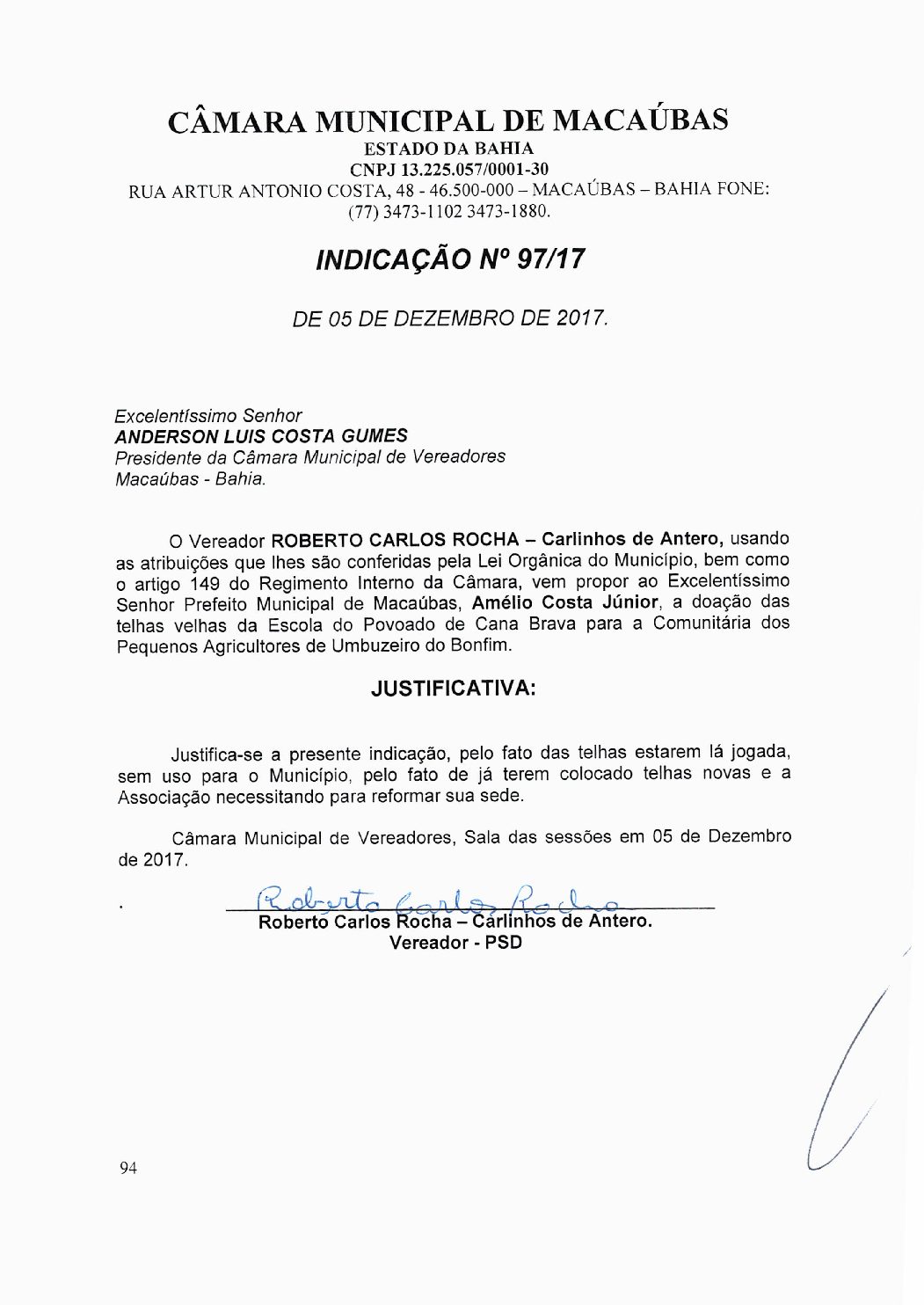 INDICAÇÃO Nº 97/17 da autoria do vereador Roberto Carlos Rocha
