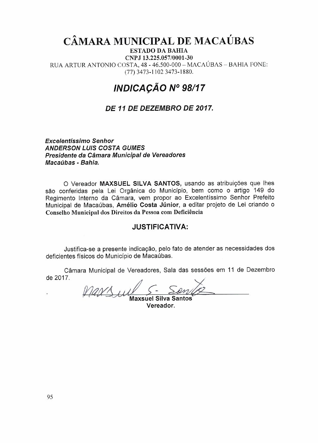 INDICAÇÃO Nº 98/17 da autoria do vereador Maxuel Silva Santos