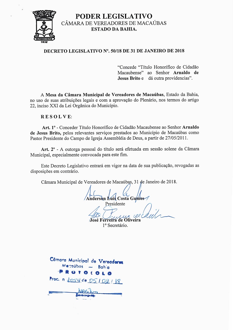 DECRETO LEGISLATIVO Nº 50/2018 “Concede Titulo Honorifico de Cidadão Macaubense ao Senhor Arnaldo de Jesus Brito e da outra providencia”