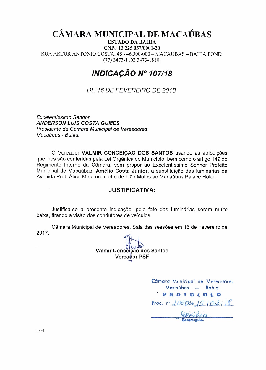 INDICAÇÃO Nº 107/18 de autoria do vereador Valmir Conceição dos Santos