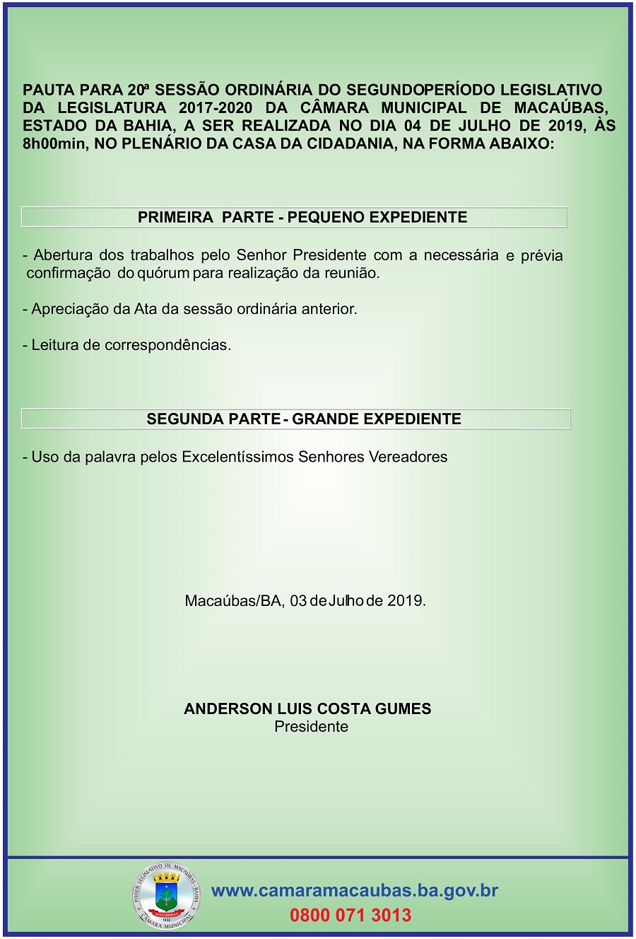A Câmara Municipal de Vereadores de Macaúbas estará realizando a 20ª Sessão Ordinária na manhã desta quinta-feira, 04 de julho de 2019. Com a redução de 45 para 15 dias de recesso, os trabalhos no Poder Legislativo retomaram essa semana, dando inicio ao segundo Período de 2019 com o mesmo compromisso e transparência que vem sendo desenvolvido na Casa Legislativa.