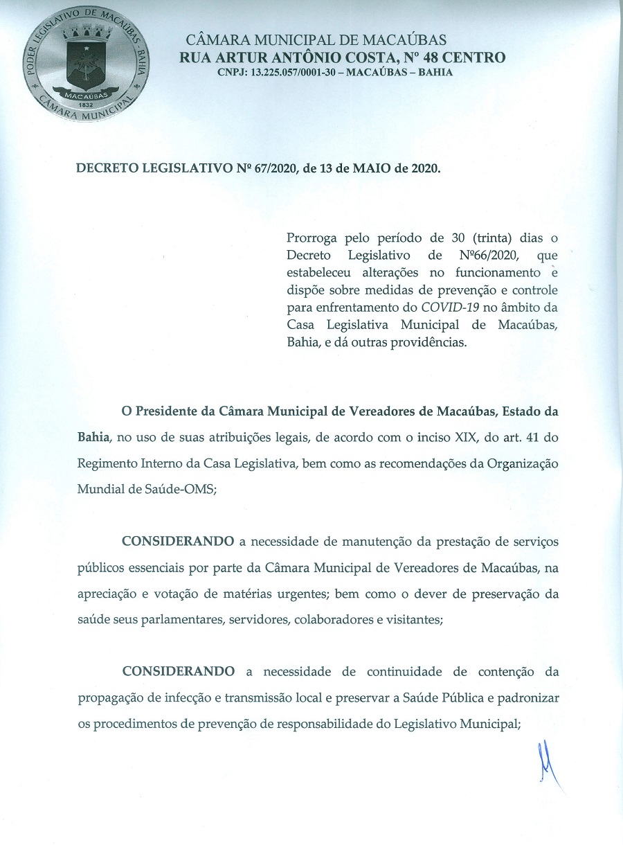 O novo Decreto prorroga pelo o período de 30 dias o Decreto Legislativo Nº 66/2020, que estabeleceu alterações no funcionamento e dispõe sobre medidas de prevenção e combate para o enfrentamento do COVID-19 no âmbito da Casa Legislativa Municipal de Macaúbas, Bahia e dá outras providencias.