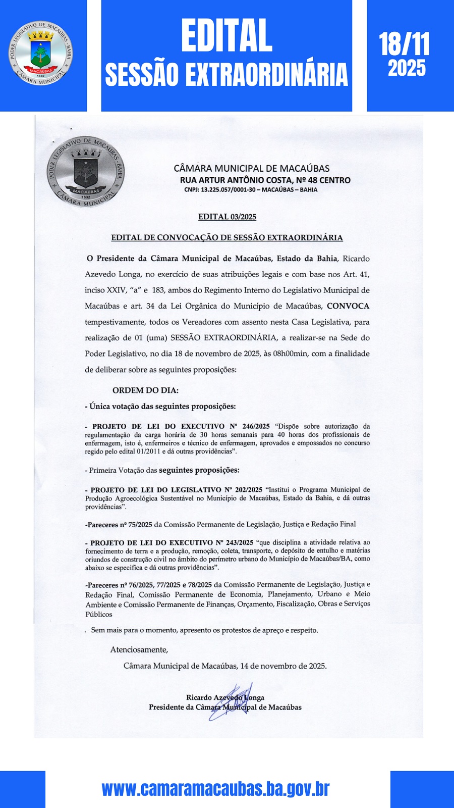 EDITAL DE CONVOCAÇÃO DE SESSÃO EXTRAORDINÁRIA PARA O DIA 18 DE NOVEMBRO DE 2025 por CMM | nov 14, 2025 | Câmara | 0 Comentários Compartilhar Enviar Comentário Cancelar respostaO seu endereço de e-mail não será publicado. Campos obrigatórios são marcados com *Comentário * Nome * E-mail * Site Δ