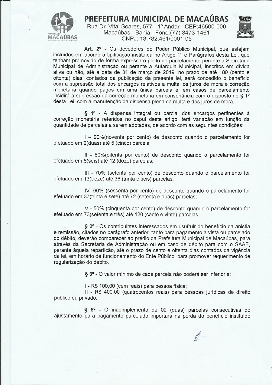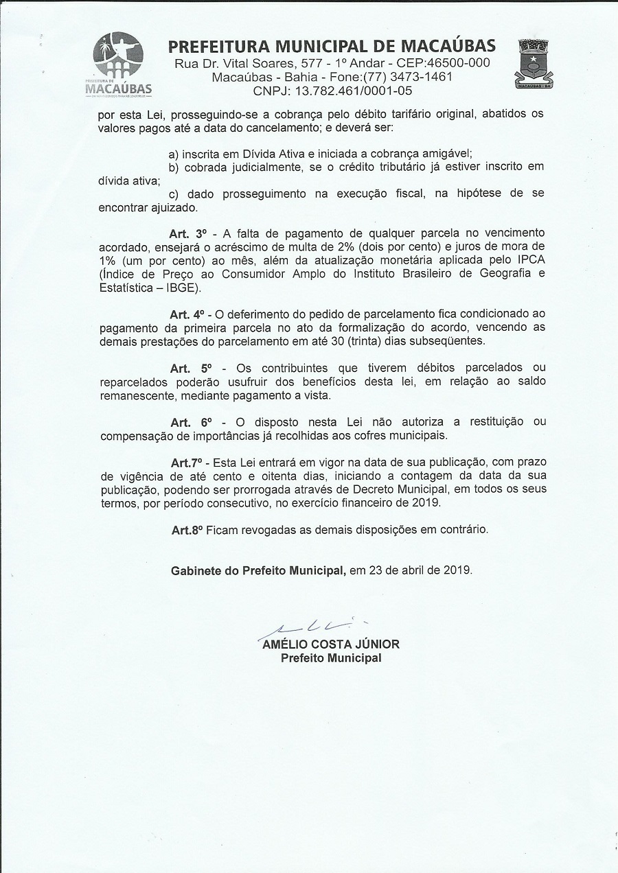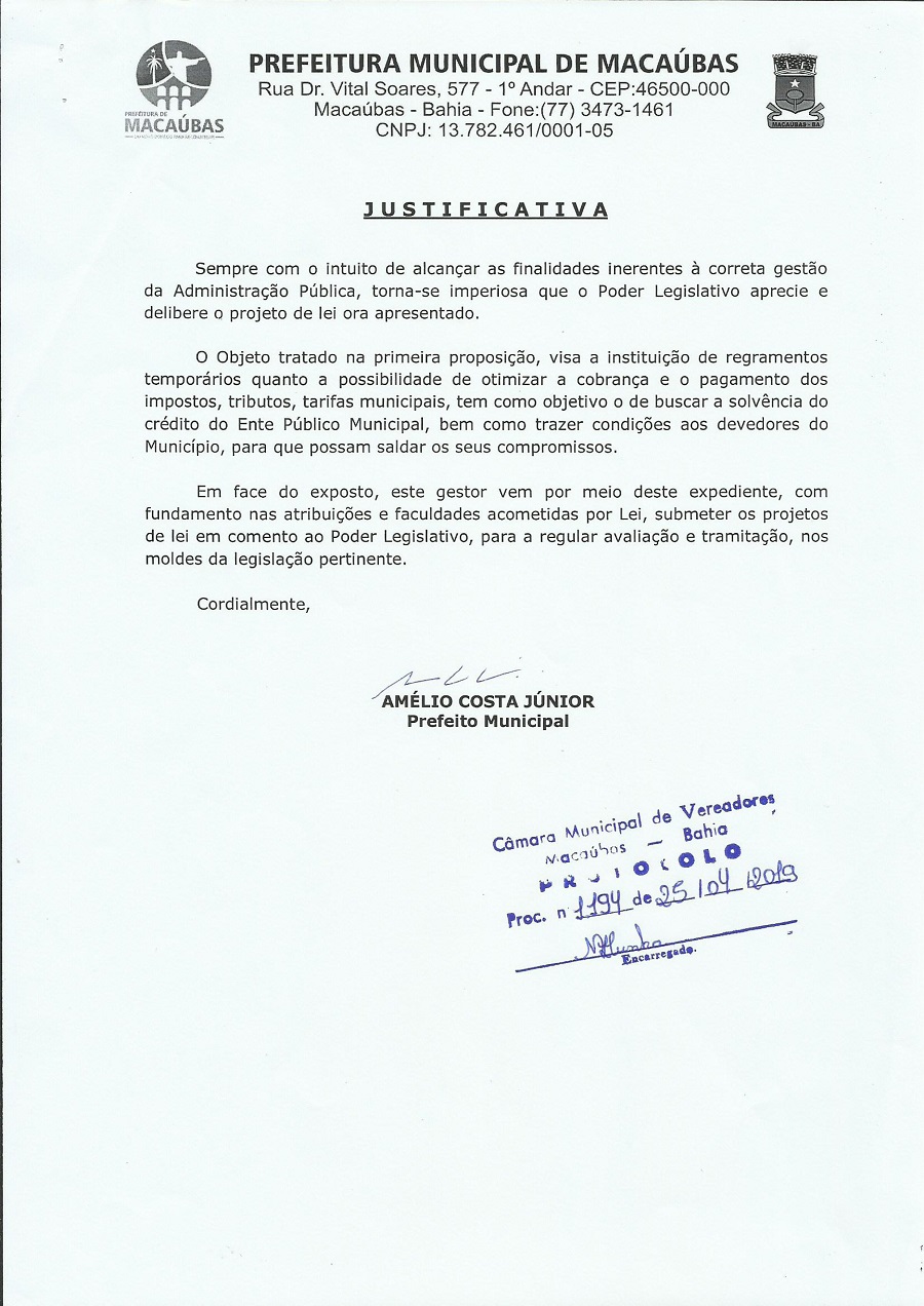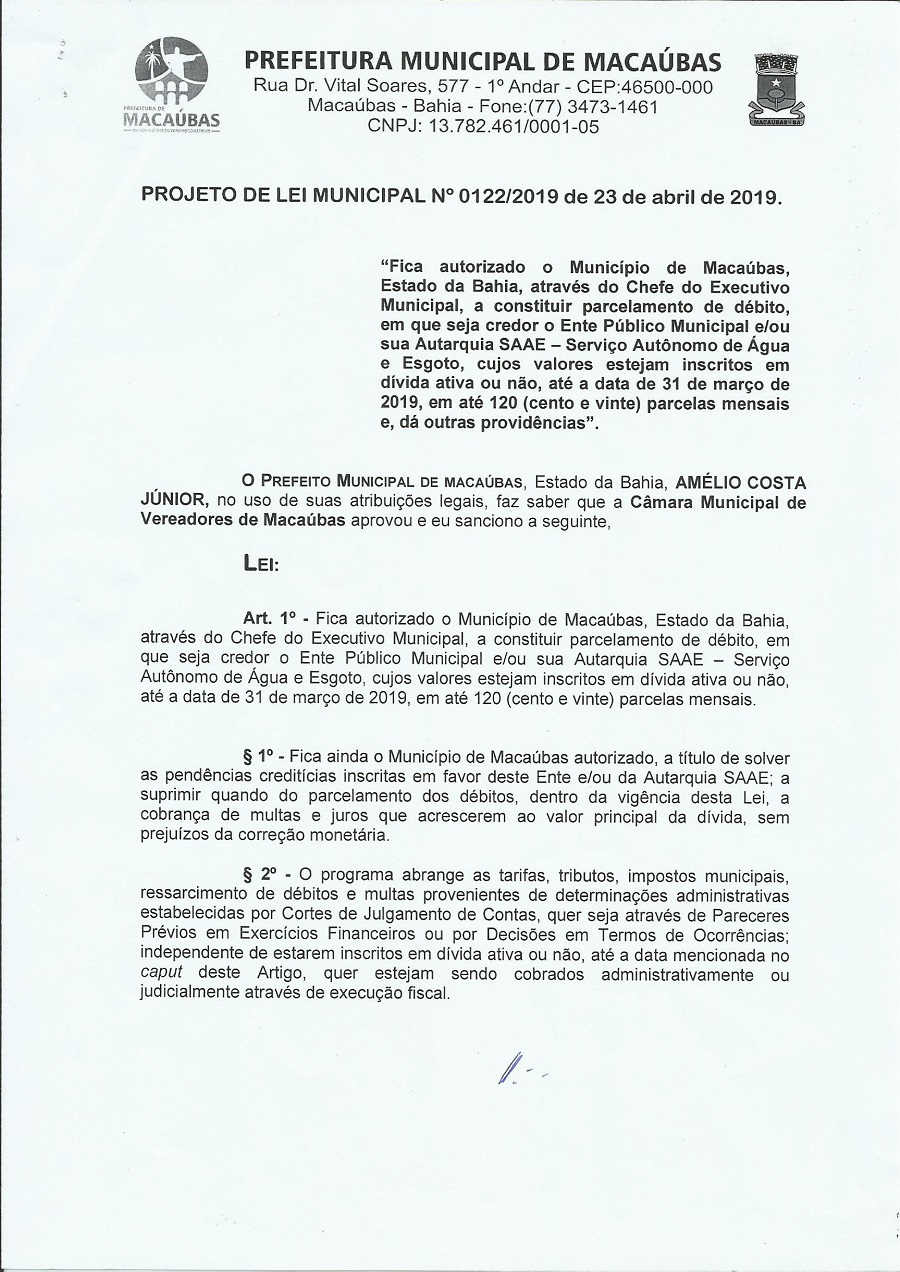 O PROJETO DE LEI DO EXECUTIVO Nº 122/2019 “Fica autorizado o Município de Macaúbas, Estado da Bahia, através do Chefe do Executivo Municipal, a constituir parcelamento de debito em que seja credor o Ente Publico Municipal e/ou sua Autarquia SAAE – Serviço Autônomo de Água e Esgoto, cujos valores estejam inscritos em divida ativas ou não, ate a data de 31 de março de 2019, em ate 120 (cento e vinte) parcelas mensais e da outras providencias” foi apresentado na 14ª Sessão Ordinária do Primeiro Período Legislativo da Legislatura 2017-2020 da Câmara Municipal de Macaúbas, Estado da Bahia, realizada na quinta-feira, dia 09 de maio de 2019, às 8h00min, no Plenário da Casa da Cidadania. Veja abaixo o projeto completo: