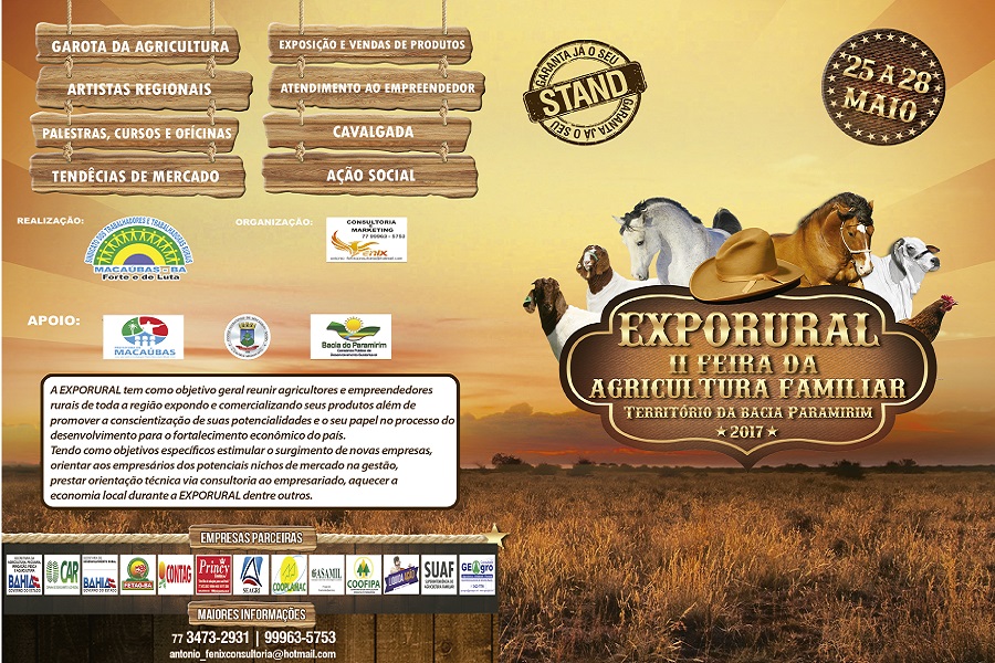 A II EXPORURAL e II Feira da Agricultura Familiar da Bacia do Paramirim acontecerá nos dias 25 a 28 de Maio de 2017 na casa de show PRINCY EVENTOS em Macaúbas – BA.