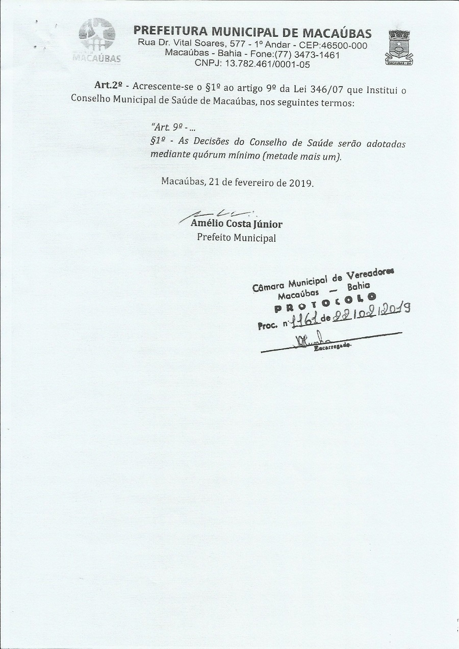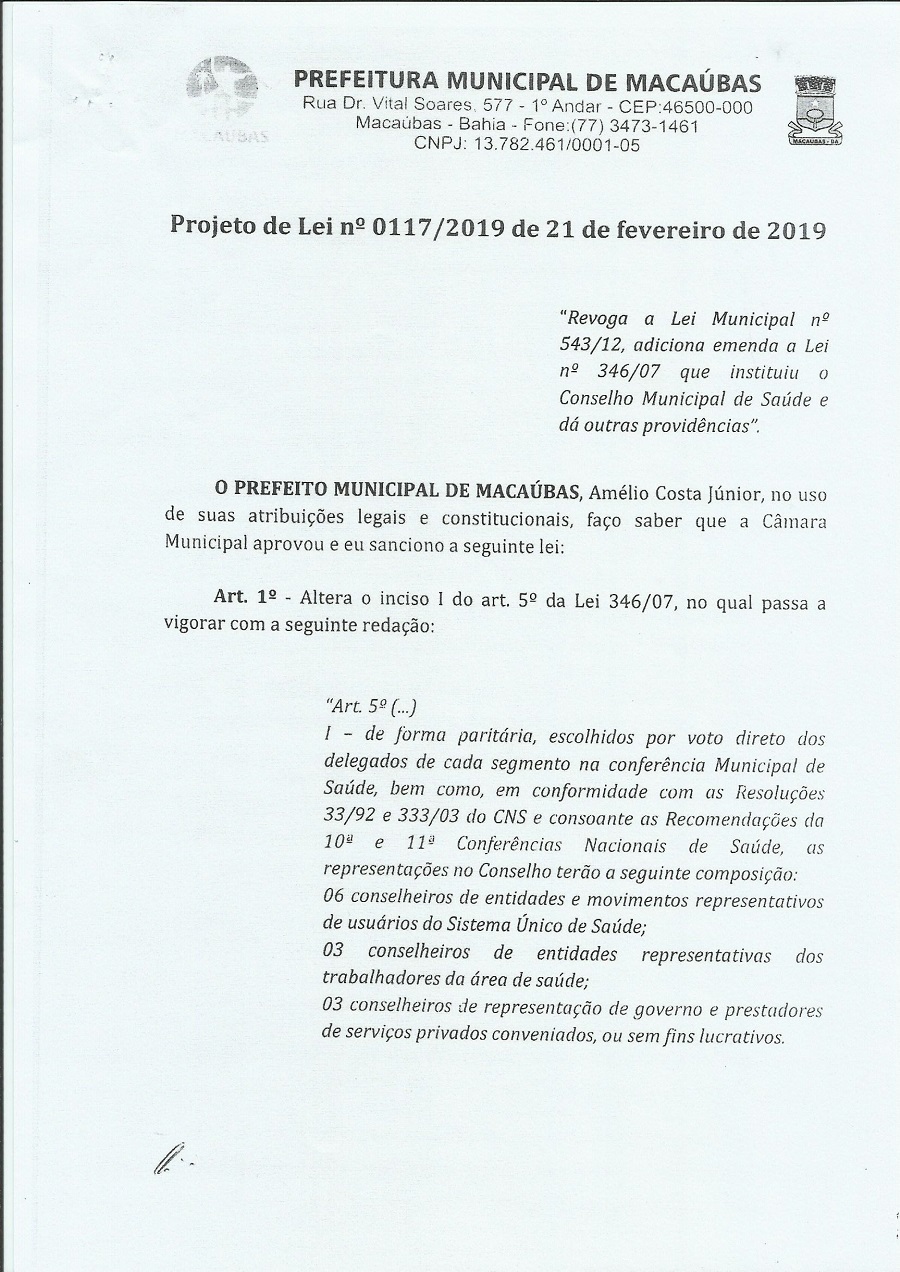 O PROJETO DE LEI DO EXECUTIVO Nº 117/2019 que Revoga a Lei Municipal nº 543/12, adiciona emenda a Lei nº 347/07 que institui o Conselho Municipal de Saúde e da outras providencias foi apresentando na 8ª Sessão Ordinária do Primeiro Período Legislativo da Legislatura 2017-2020 da Câmara Municipal de Macaúbas, Estado da Bahia, realizada na quinta-feira, dia 14 de Março de 2019, às 8h00min, no Plenário da Casa da Cidadania. Veja abaixo o projeto completo:
